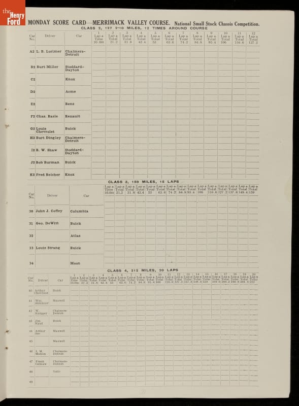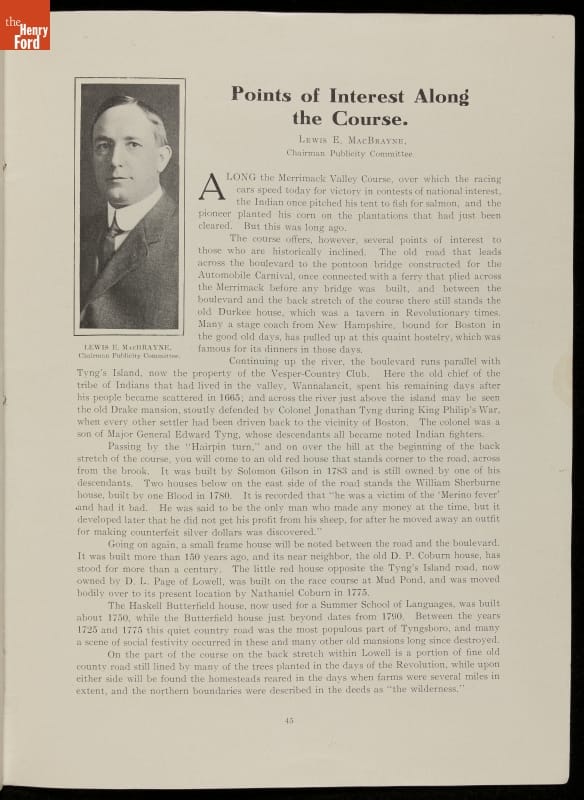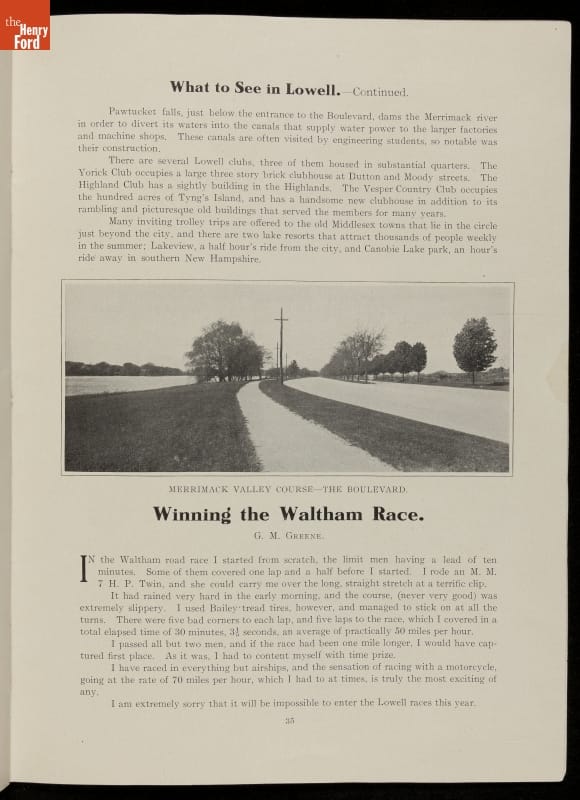 Lowell, Massachusetts, hosted automobile races in 1908 and 1909 on a 10.6-mile circuit laid out on city streets. The four-mile straightaway along Pawtucket Boulevard had originally been built for harness racing. Motor Age described a 1909 race on the Merrimack Valley Course as "one of the greatest of its kind," but the competitions were not successful financially.