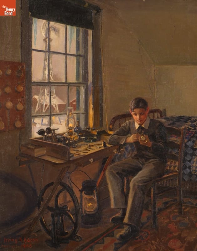 Henry Ford had his favorite artist Irving Bacon paint several scenes Henry remembered from his childhood. This painting depicts a young Henry working on watches at a small bench set up in his bedroom.