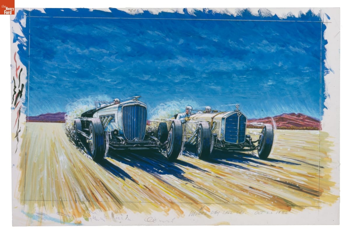 Bill Mitchell, head of design at General Motors from 1958 to 1977, painted this scene following his retirement. It shows a 1932 race on Muroc (now Rogers) Dry Lake. The lakebed, located in southern California's Mojave Desert, was used for racing and land speed runs into the 1930s, when it became a part of Edwards Air Force Base.