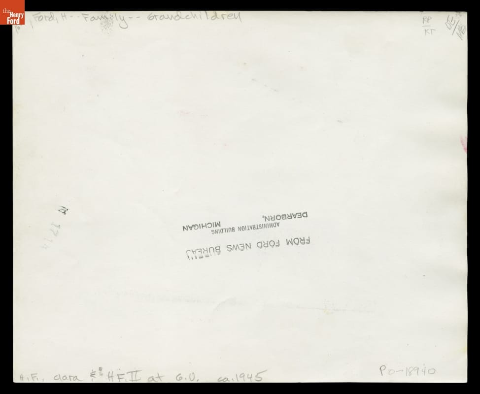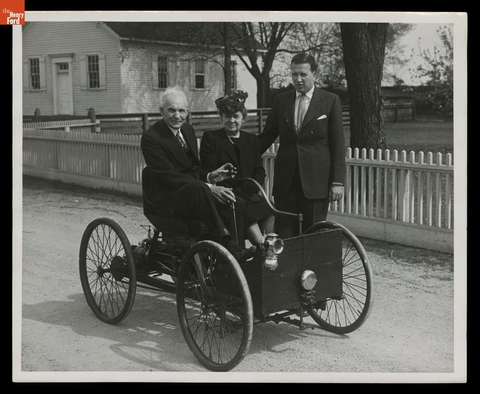 This photograph commemorates the 50th anniversary of Henry Ford's first automobile, the Quadricycle, in 1946. Posed in his historical outdoor museum -- Greenfield Village in Dearborn, Michigan -- Henry and his wife Clara sit in the vehicle. They are joined by their grandson Henry Ford II, President of Ford Motor Company.