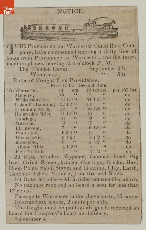 The first half of the 19th century was the heyday of canal construction and use in the United States, providing easier access to territories for settlement and commerce. This advertisement of the Providence and Worcester Canal Boat Company, from September 8, 1829, supplied dates and times of departure, along with freight and passenger rates between the two cities.