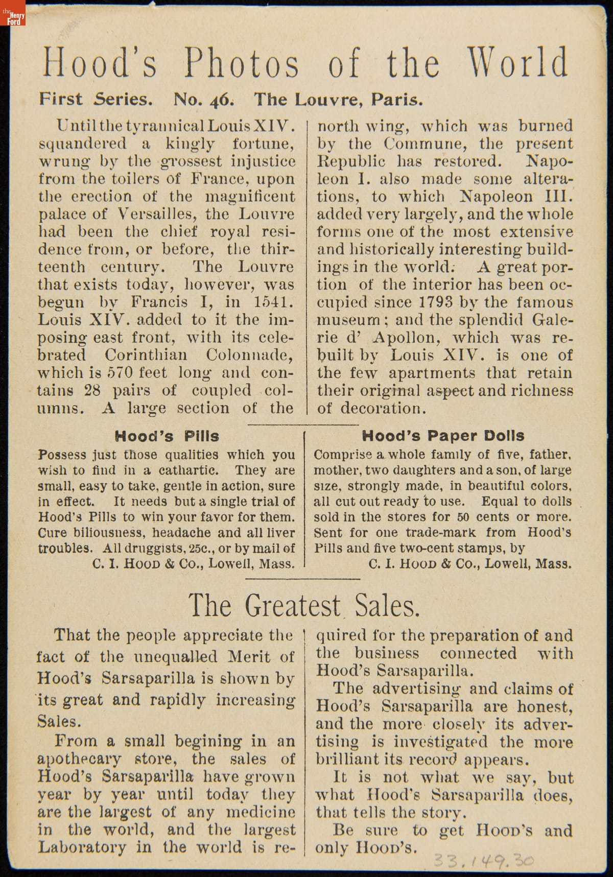 Trade Card for C.I. Hood & Co. with Hood's Photos of the World, "Louvre, Paris," 1890-1910