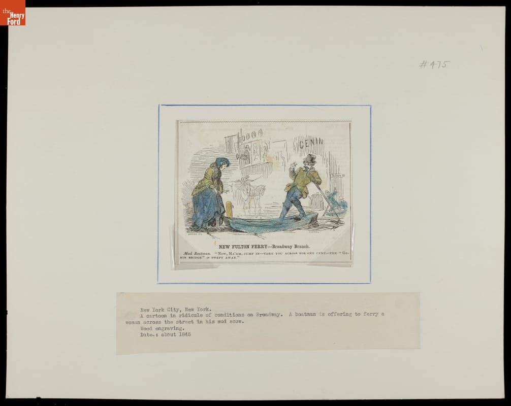 Description beneath: New York City, New York. A cartoon in ridicule of conditions on Broadway. A boatman is offering to ferry a woman across the street in his mud scow. Wood engraving. Date: about 1845.
