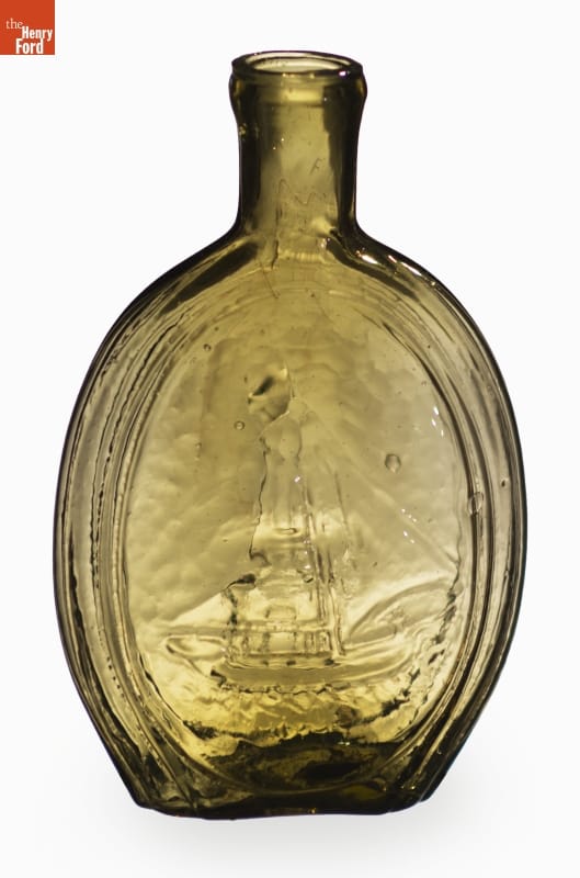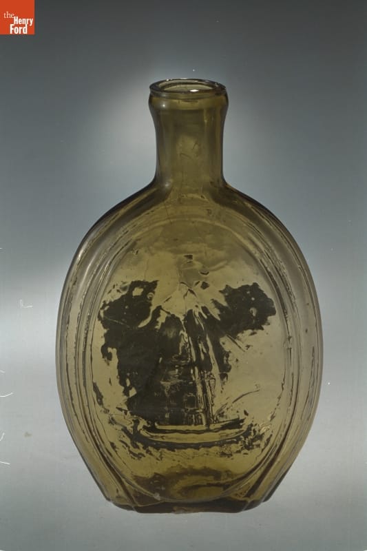 Glass factories in America began producing inexpensive, mold-formed flasks in the early 1800s. These figured flasks, often decorated with symbols of national or civic pride, appealed to America's common man. Citizens of Baltimore, Maryland, would have recognized the image of the city's Washington Monument on this locally made flask. And the sloop would have been a familiar sight to those living in this port city.