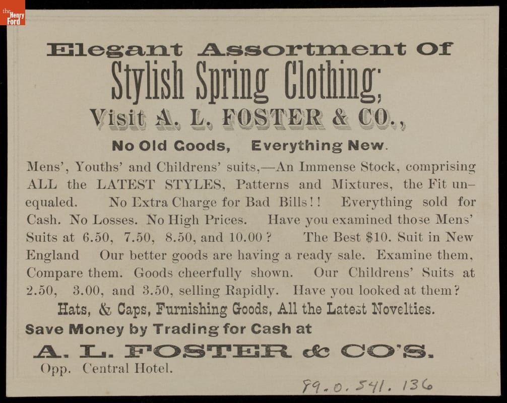 Trade Card for Stylish Spring Clothing, A. L. Foster & Co., 1882