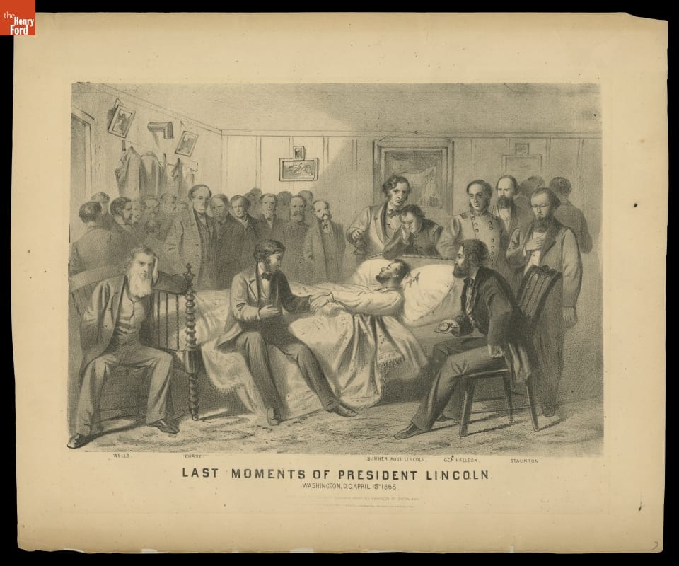 Below image: LAST MOMENTS OF PRESIDENT LINCOLN./WASHINGTON, D.C. APRIL 15TH 1865./ISSUED FROM BUFFORDS' PRINT PUBLISHING HOUSE, 818 WASHINGTON ST. BOSTON, MASS./Entered according to Act of Congress in the Year 1865 by J.H. Bufford in the Clerk's Office of the District Court of the District of Mass. Print is keyed from left to right WELLS. CHASE. SUMNER. ROB'T LINCOLN. GEN HALLECK. STAUNTON.