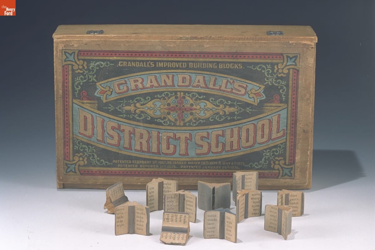 CRANDALL'S IMPROVED BUILDING BLOCKS / CRANDALL'S / DISTRICT SCHOOL / PATENTED FEBRUARY 5TH 1867. RE-ISSUED MARCH 30TH 1875 & MAY 4TH 1875 / PATENTED OCTOBER 11TH 1875. PATENTED JANUARY 25TH 1876. [lithograph on box lid]