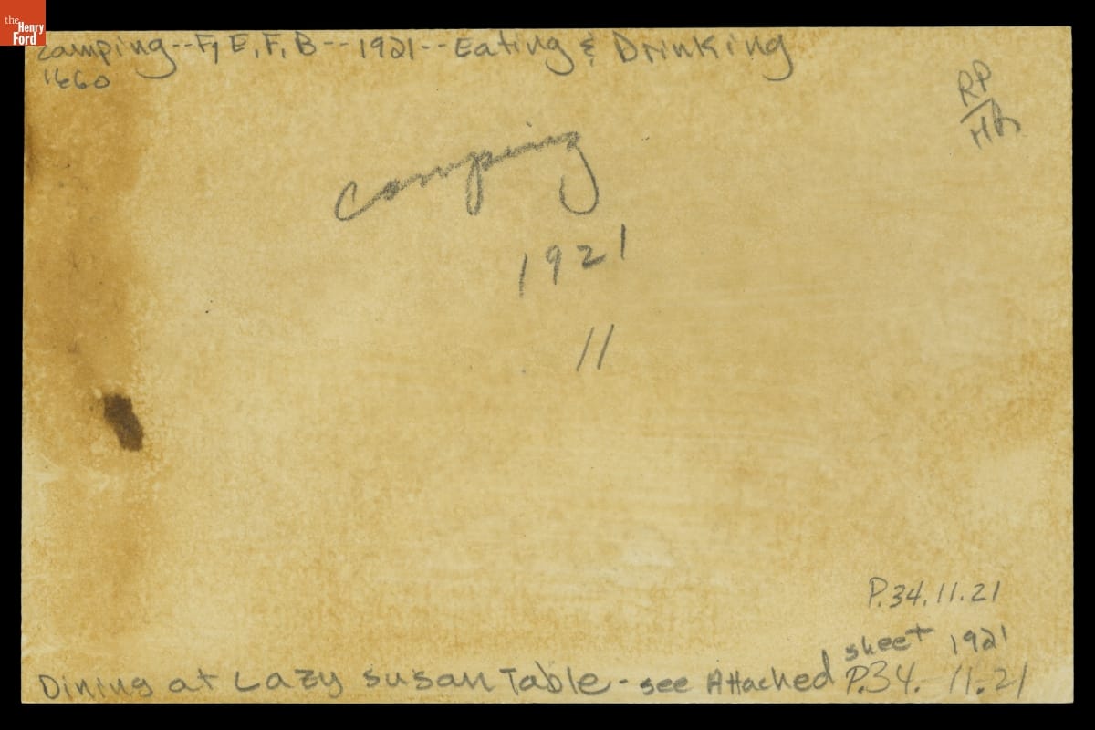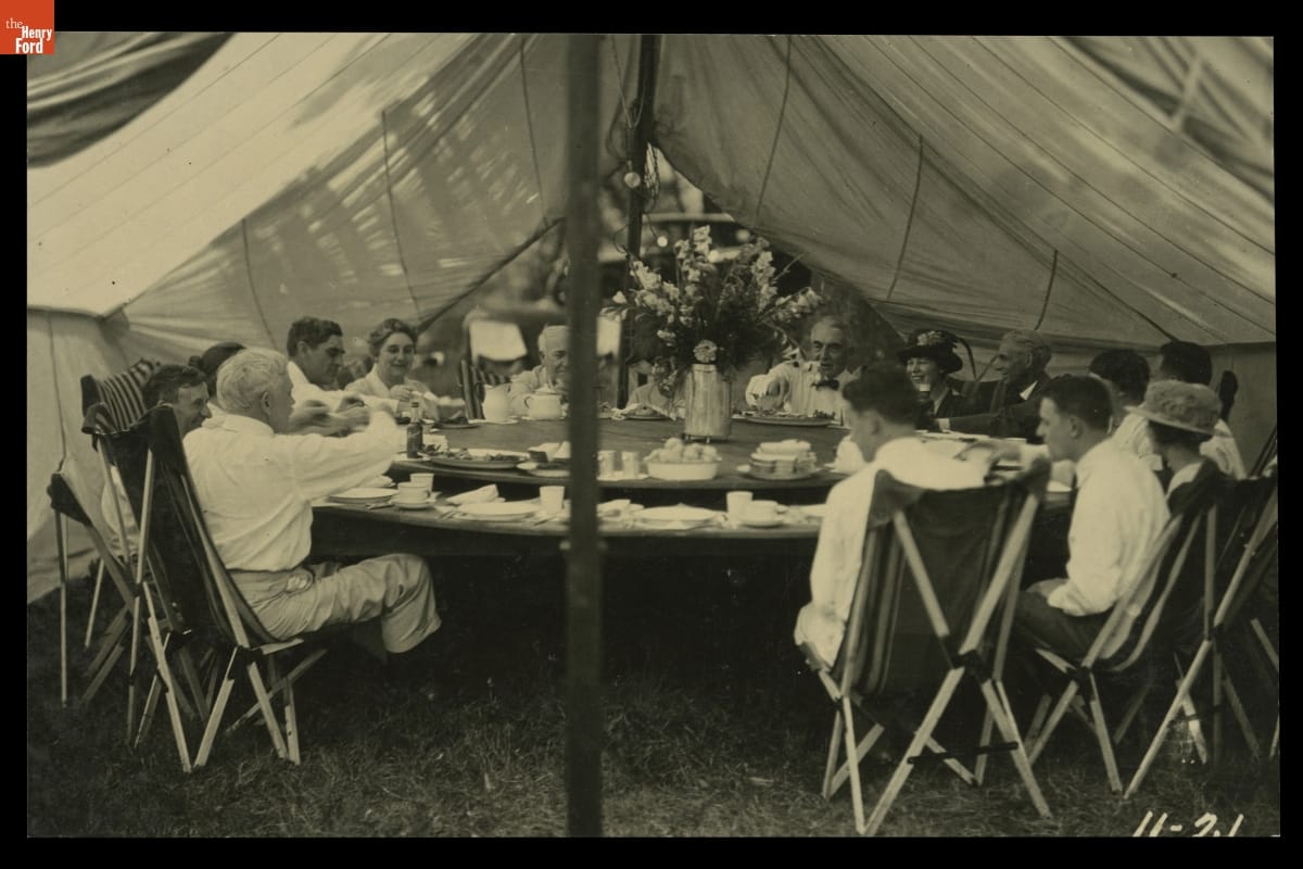 Between 1916 and 1924, Henry Ford, Thomas Edison, Harvey Firestone, and John Burroughs, calling themselves the Vagabonds, embarked on a series of camping trips. This image, from 1921, shows the Vagabonds (minus Burroughs, who had died earlier in the year) dining with family and friends near Hagerstown, Maryland. One of their friends at the table is President Warren G. Harding.
