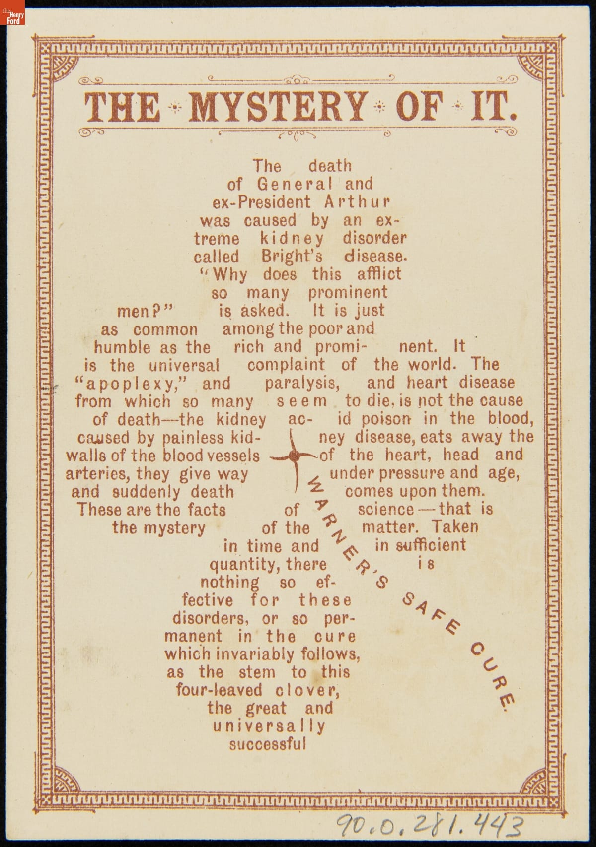 Hulbert Harrington Warner, a wealthy fire- and burglar-proof safe manufacturer, purchased medicinal formulas in the late 1800s and turned them into a multi-million-dollar patent medicine business. He also made and sold yeast. This trade card's colorful illustration touted Warner's "Safe" yeast -- alluding to his original business enterprise. The reverse advertised one of his "safe" cures, though it provided few medical benefits.