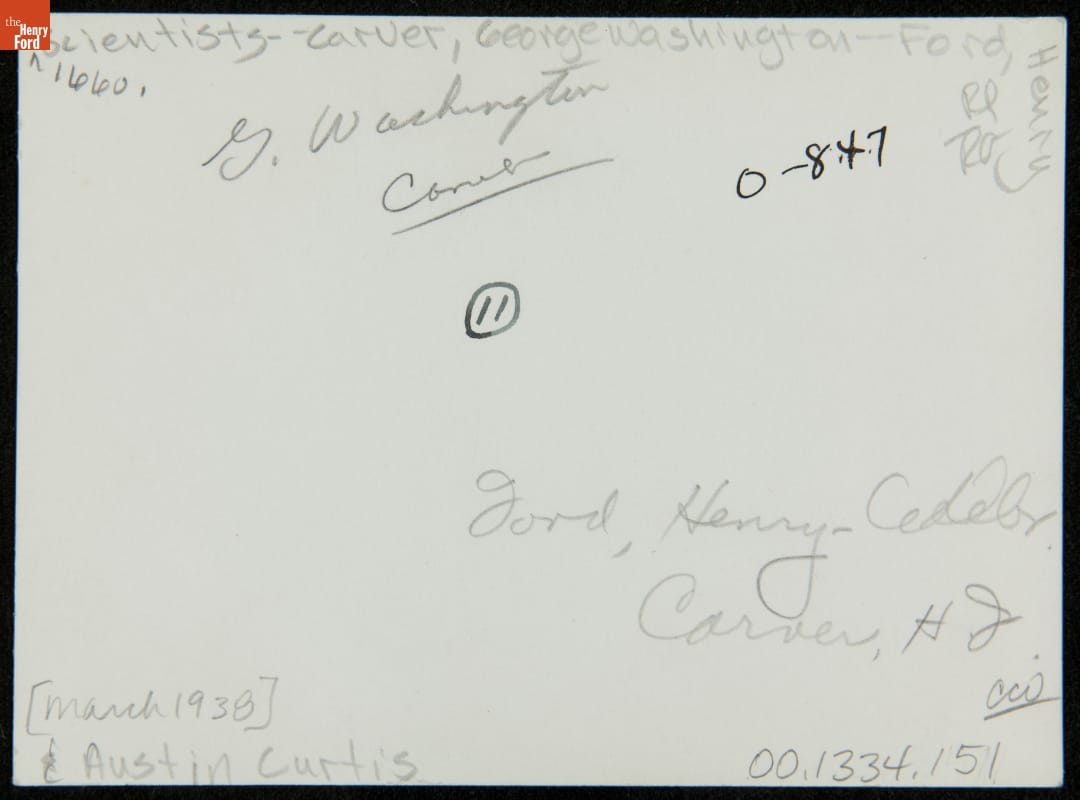 In March 1938, Henry Ford visited George Washington Carver at the Tuskegee Institute in Alabama, as seen in this photo. They had met in person the previous year when Carver visited Dearborn for a conference on "chemurgy," the science of making industrial products from crops. The two were close friends and colleagues and visited each other several additional times before Carver's death in 1943.