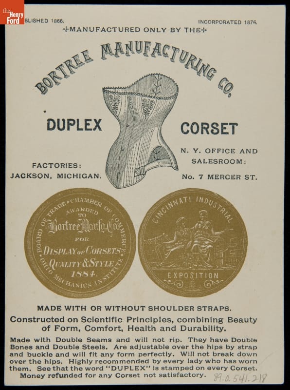 The hourglass figure deemed fashionable in the late 19th century was made possible by the use of extremely uncomfortable and constricting undergarments, especially the corset. The Bortree Manufacturing Company was similar to other corset manufacturers in its claim that its corsets were not only beautiful but also comfortable and healthful -- claims with which both physicians and health reformers vehemently disagreed.