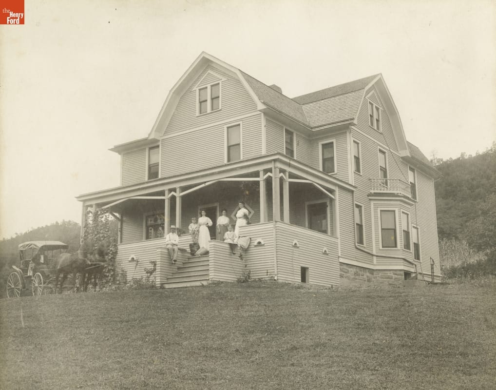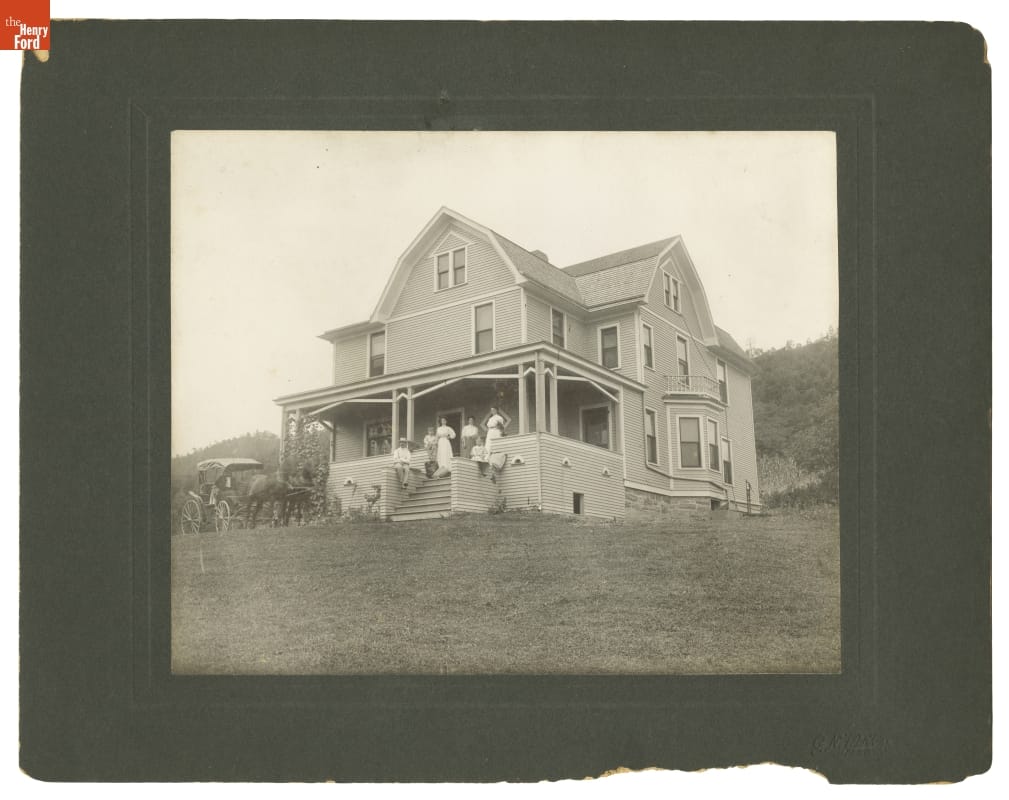 House with People Gathered on the Porch and Horse-Drawn Buggy in Front, circa 1905