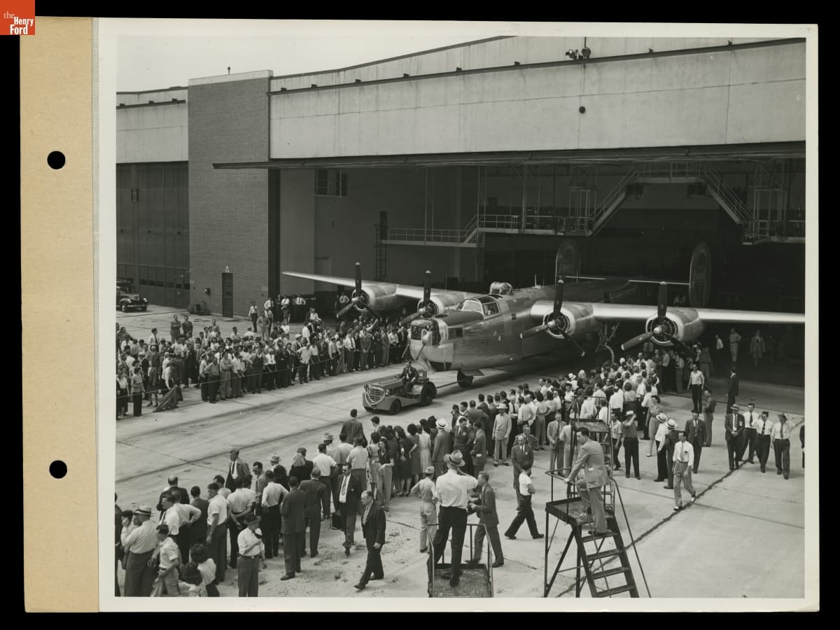 Ford Motor Company built 8,685 B-24 bomber airplanes at its Willow Run, Michigan, plant during World War II. Workers turned out the last bomber in late June 1945. Henry Ford II attended the ceremony as that last bomber was towed from its hangar. Some 42,000 people worked at Willow Run. At peak production, they finished one airplane every 63 minutes.