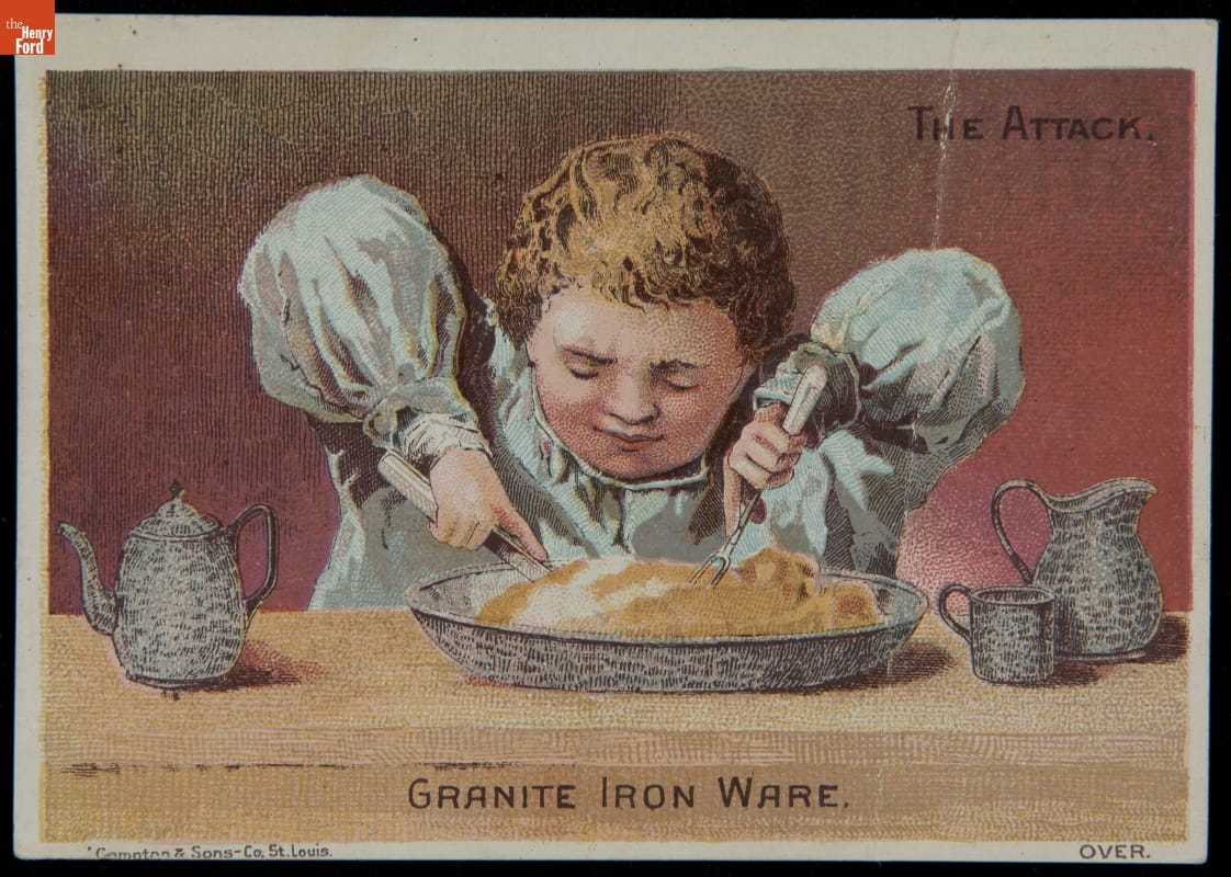 As color printing gained momentum in the late 19th century, trade cards became a major means of advertising goods and services. Trade cards for the St. Louis Stamping Company informed customers of the light, durable, and attractive qualities of Granite Iron Ware -- made of metal coated with an enamel that resembled granite.