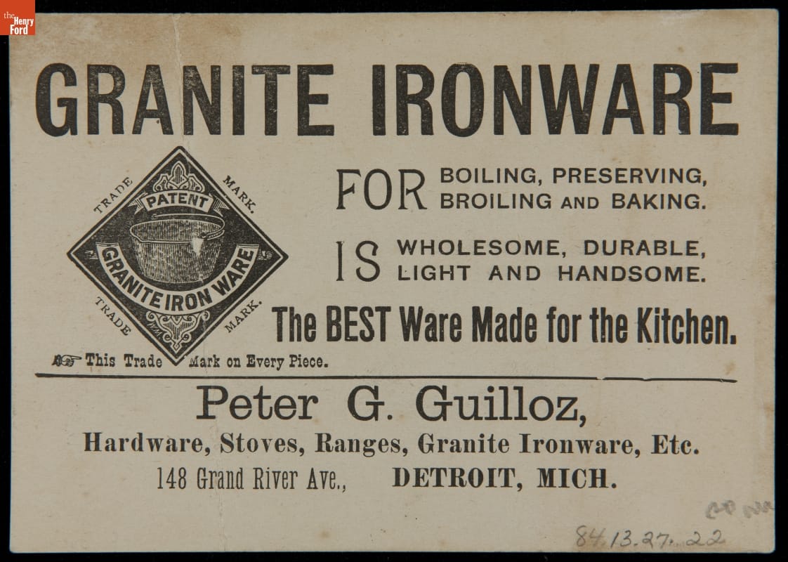 Text on reverse, in part: FOR BOILING, PRESERVING, BROILING AND BAKING. IS WHOLESOME, DURABLE, LIGHT AND HANDSOME. The BEST Ware Made for the Kitchen. Peter G. Guilloz, Hardware, Stoves, Ranges, Granite Ironware, Etc...DETROIT, MICH./