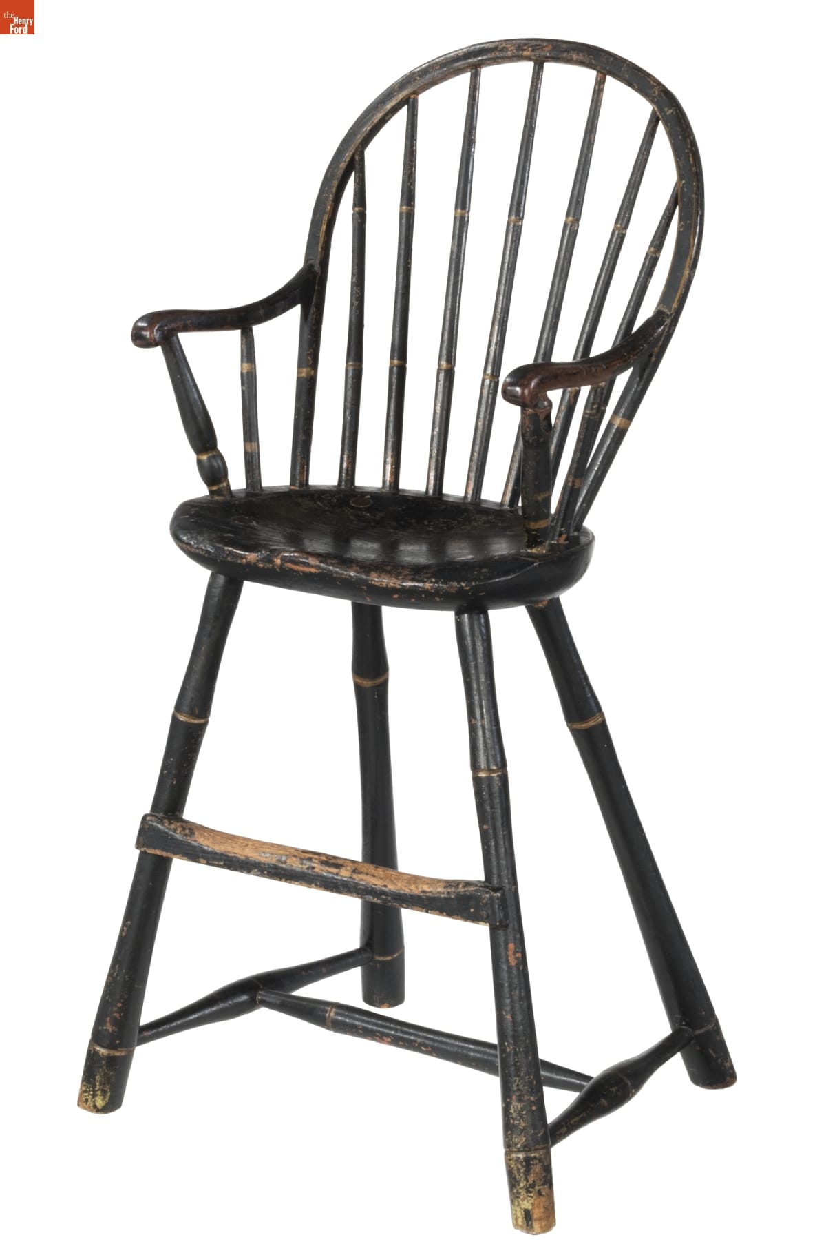 This Windsor highchair allowed a child to sit at the same level as the dining table making it easier for parents to feed the child. Highchairs, however, were not a common piece of household furniture in the late 18th or early 19th centuries. Most small children had to sit on someone's lap or otherwise get a boost to table level during meals.