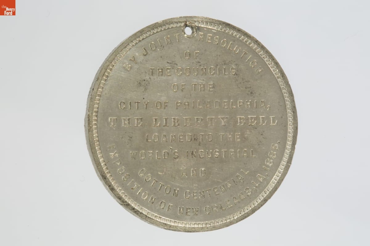 side 1: BY JOINT RESOLUTION / OF / THE COUNCILS / OF THE / CITY OF PHILADELPHIA / THE LIBERTY BELL / LOANED TO THE / WORLD'S INDUSTRIAL / AND COTTON CENTENNIAL / EXPOSITION OF NEW ORLEANS, LA 1885
