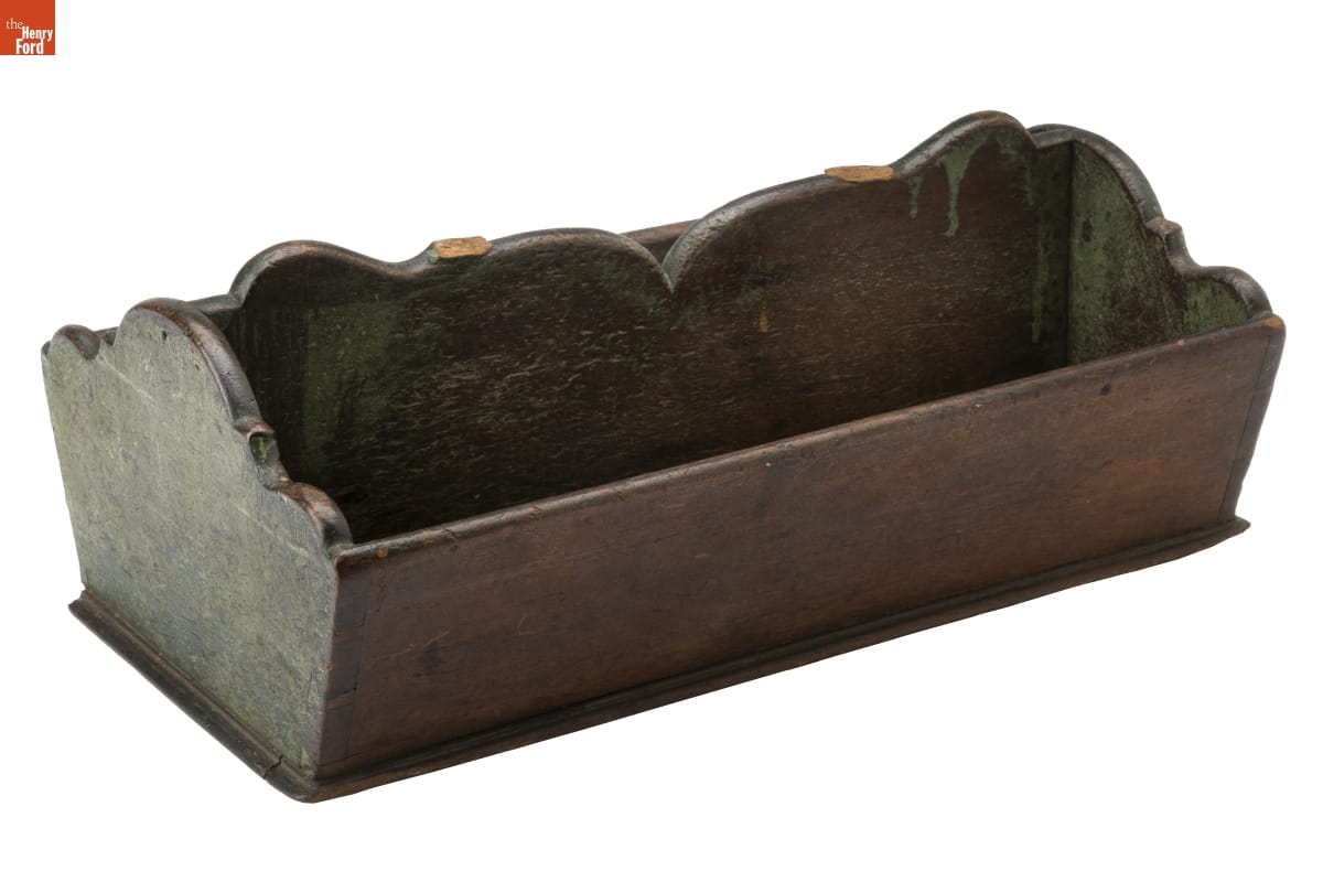 This wooden tray or "box" held knives, forks, spoons, and other table utensils. A person would carry this inexpensive tray to the table to dispense or collect cutlery. Most trays had flared sides, some with fancy, scrolled edges like this one. Some even had colorfully painted decorations.
