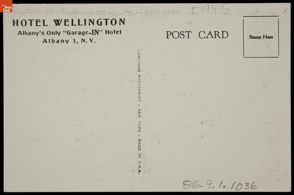 Many city hotels provided more than just sleeping accommodations. This 1949 postcard shows the dining room at the Hotel Wellington in Albany, New York.
