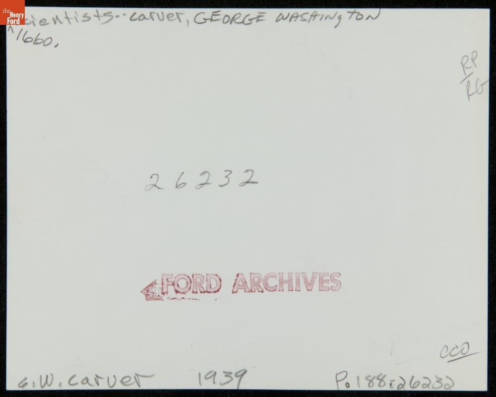 A mutual interest in industrial products made from plants brought Henry Ford and the scientist George Washington Carver together as colleagues and friends. Ford developed plastics and fibers from soybeans. Here, on a 1939 visit to Dearborn, George Washington Carver is seated in the Soybean Laboratory in Greenfield Village, holding a skein of soy fiber in his hands.