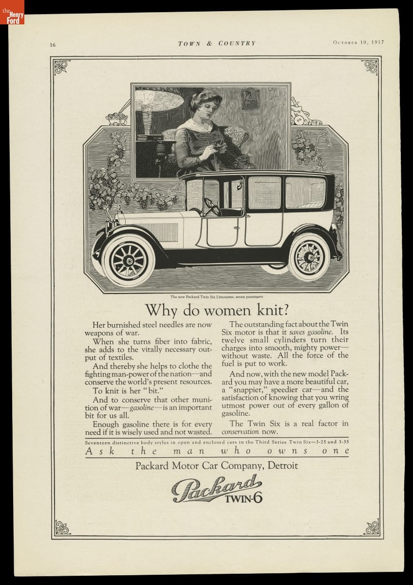 The question asked by this 1917 Packard advertisement, "Why Do Women Knit," referred to women's efforts to knit vital clothing items for American soldiers fighting in World War I. The ad also mentioned the need to conserve gasoline -- something that Packard's 12-cylinder Twin Six engine was claimed to do for its owners.