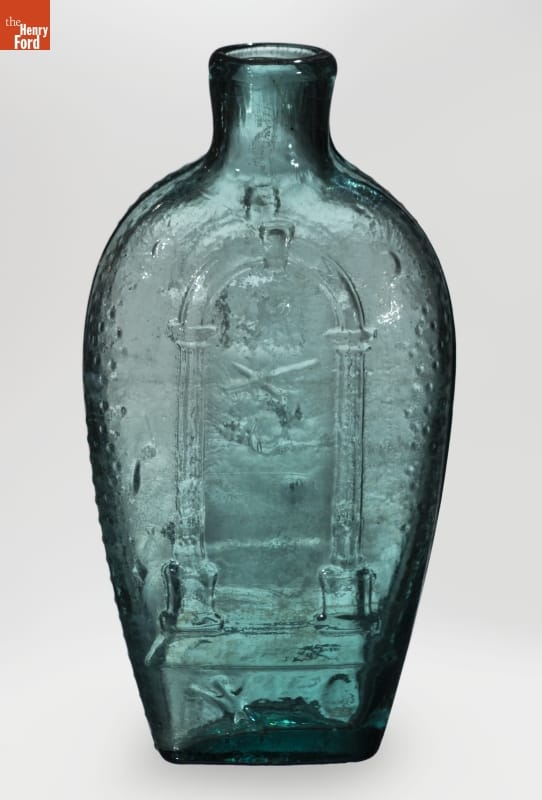 Glass factories in America began producing inexpensive, mold-formed flasks in the early 1800s. These figured flasks, often decorated with symbols of national pride or political or cultural affiliation, appealed to America's common man. Membership in the Freemasons grew in the early decades of the 1800s. Supporters of the Masonic order would recognize the ritualistic symbols on this and other similar flasks.