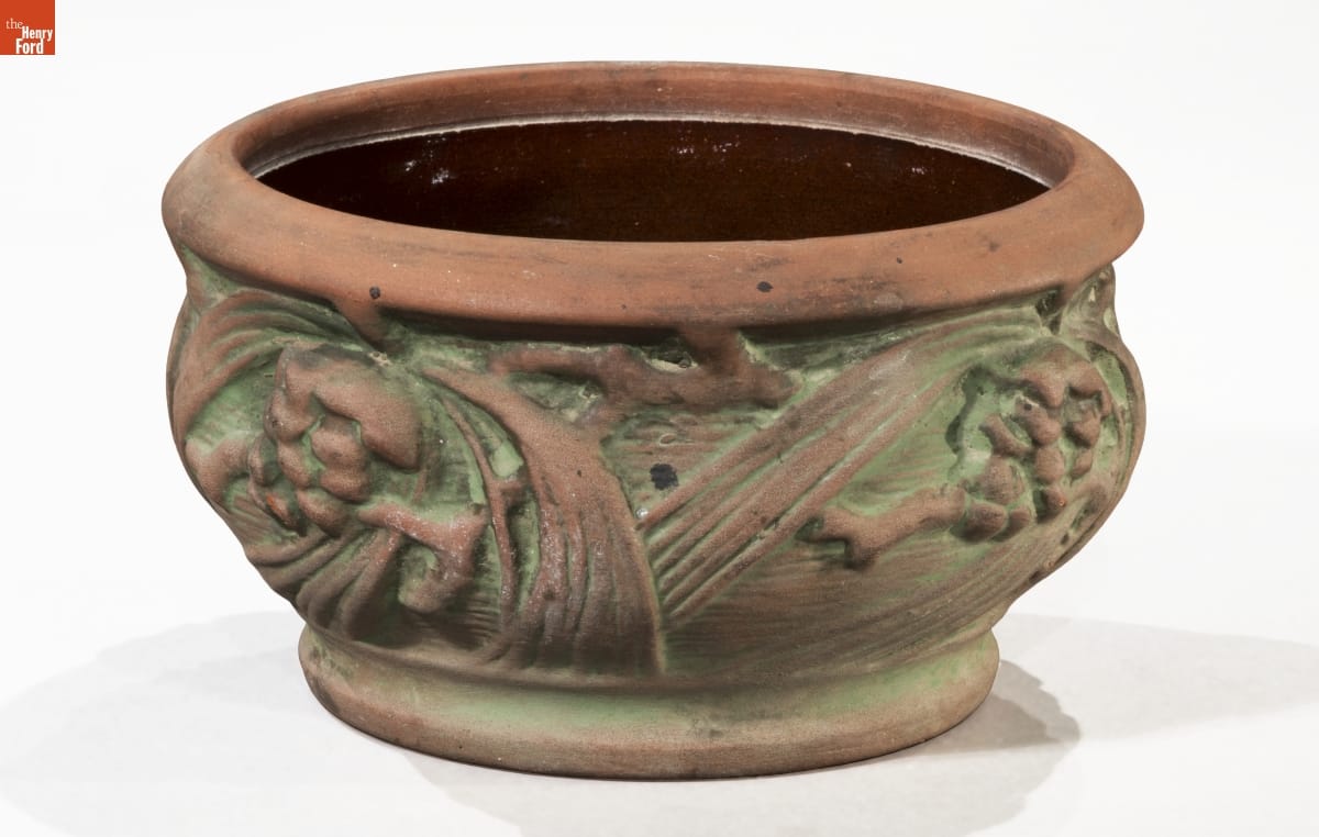 Peters and Reed pottery from Zanesville, Ohio, was known for their unique glazes and glaze treatments. This piece, from their Moss Aztec line, was made by spraying the molded designs in relief with green coloring, then wiping the top of the piece to create a "moss" effect. The natural coloring would have fit perfectly in a typical Arts and Crafts home.