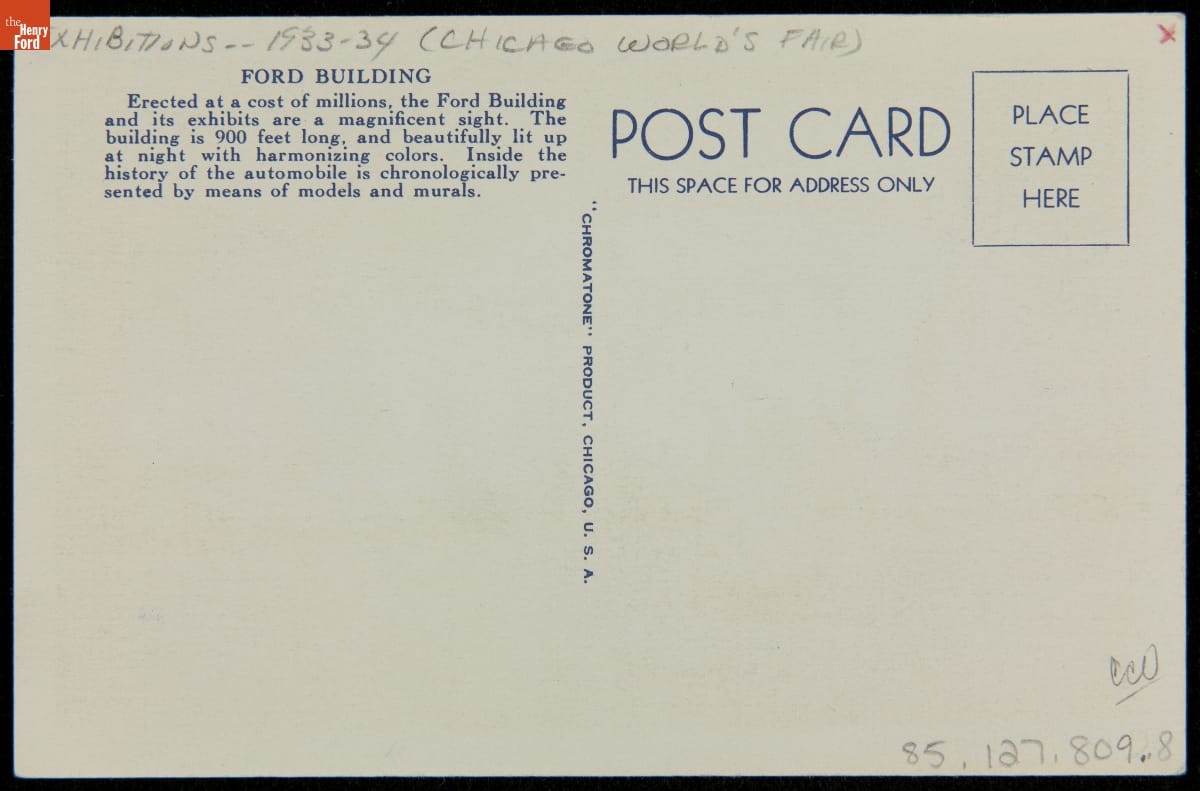 FORD BUILDING / Erected at a cost of millions, the Ford building / and its exhibits are a magnificent sight. The / building is 900 feet long, and beautifully lit up / at night with harmonizing colors. Inside the / history of the automobile is chronologically / presented by means of models and murals.