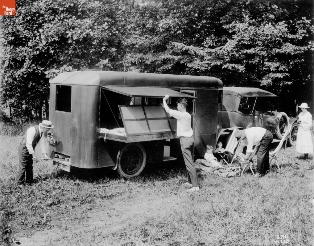 The growth of automobile ownership and development of good roads in the 1910s and 20s drove many Americans to explore the country. Some auto tourists opted to stay in the comfort of local hotels and some liked "roughing" it in tents; others wanted something in-between. Camping trailers provided a home-like shelter for a stay in nature.