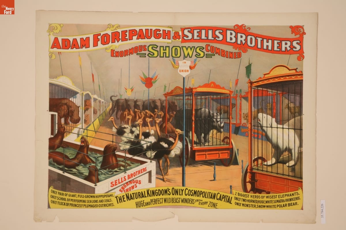 Circus poster printed at top: ADAM FOREPAUGH & SELLS BROTHERS / ENORMOUS SHOWS COMBINED / IN MIGHTY / UNION