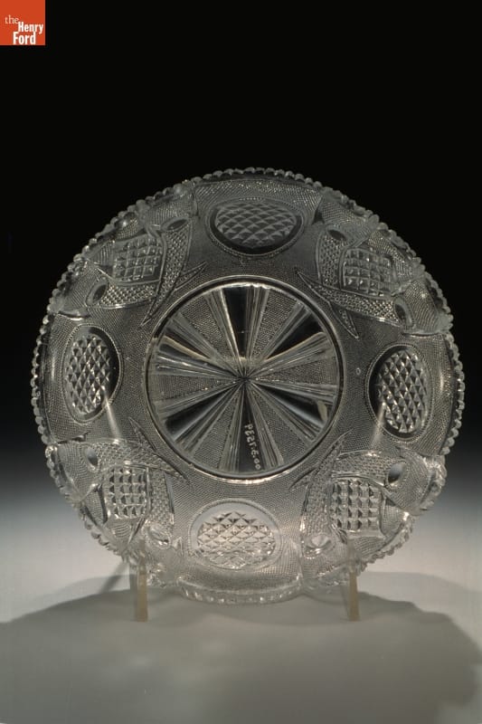 Mechanically pressed glass was an innovation in glass history, making decorative, "patterned" glass available to a broad audience. One of the earliest types of pressed glass, dating to the 1830s is known as "Lacy Glass". Complex stippled patterns were developed to help hide technical defects caused by early presses, when the glass gather was cut off and dropped into a mold.