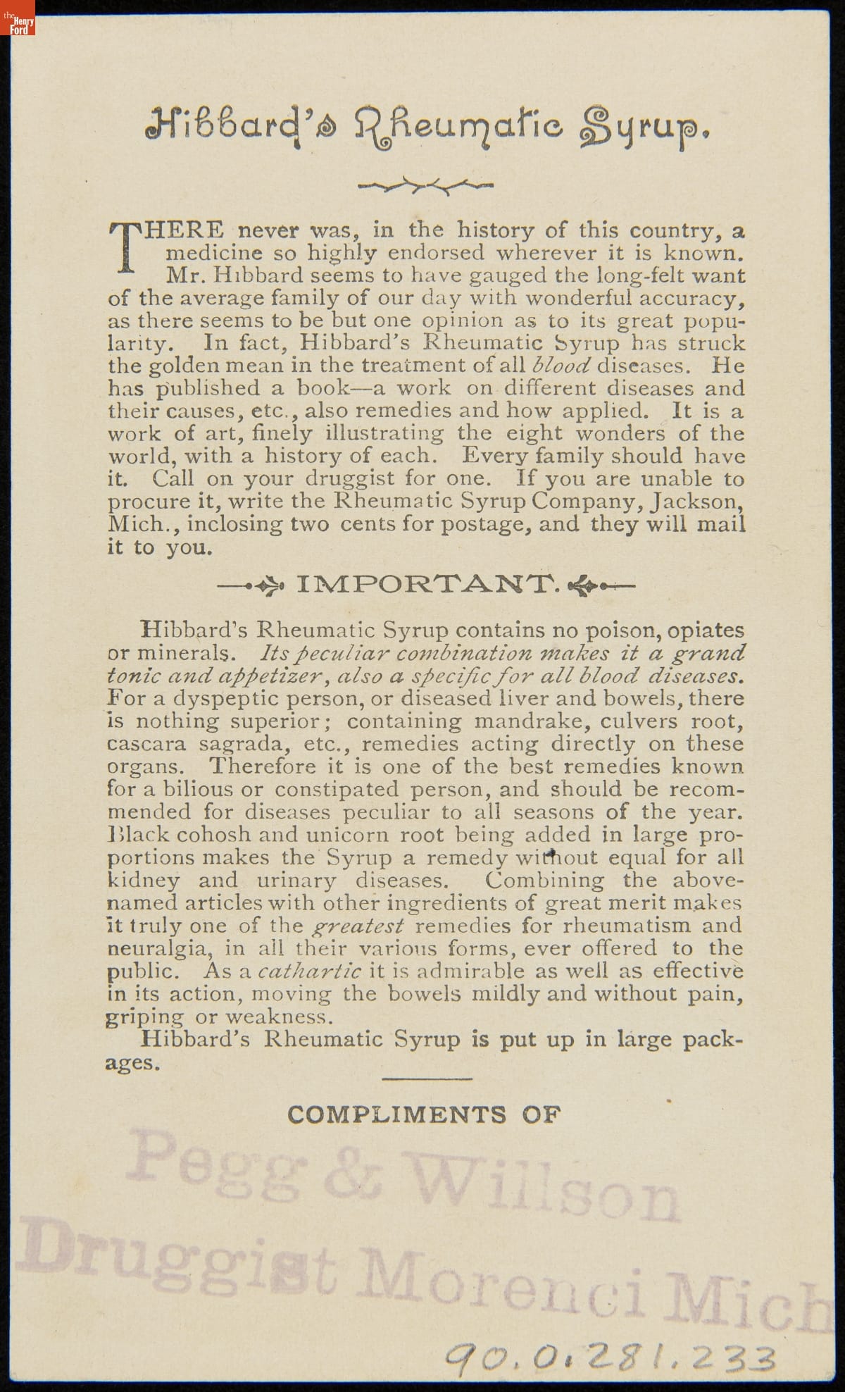 Trade Card for Hibbard's Rheumatic Syrup and Plasters, Rheumatic Syrup Company, 1880-1900