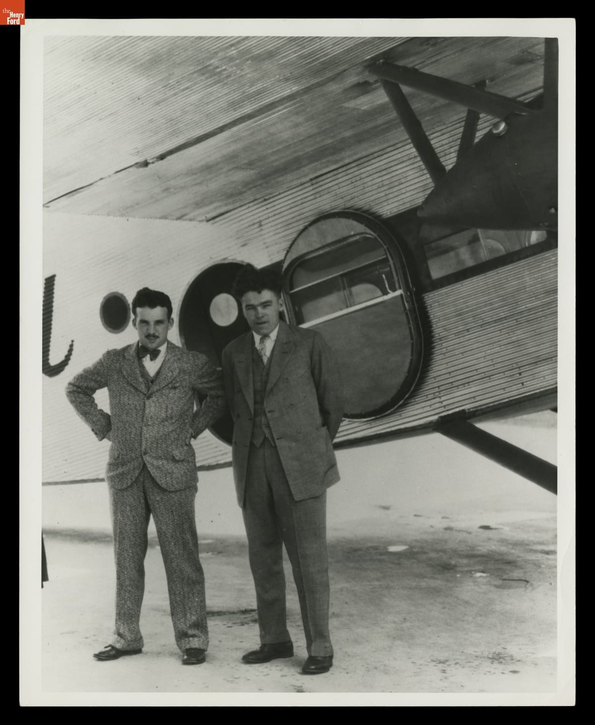 Harry Brooks (left) and Harry Russell posed with a Ford Tri-Motor for this photo in 1927. Brooks was close to Henry Ford, who considered Brooks his favorite test pilot. Mr. Ford was deeply saddened when Brooks died in the crash of a prototype Ford airplane in 1928. Russell, in addition to his skills as a mechanic, was an accomplished pilot himself.