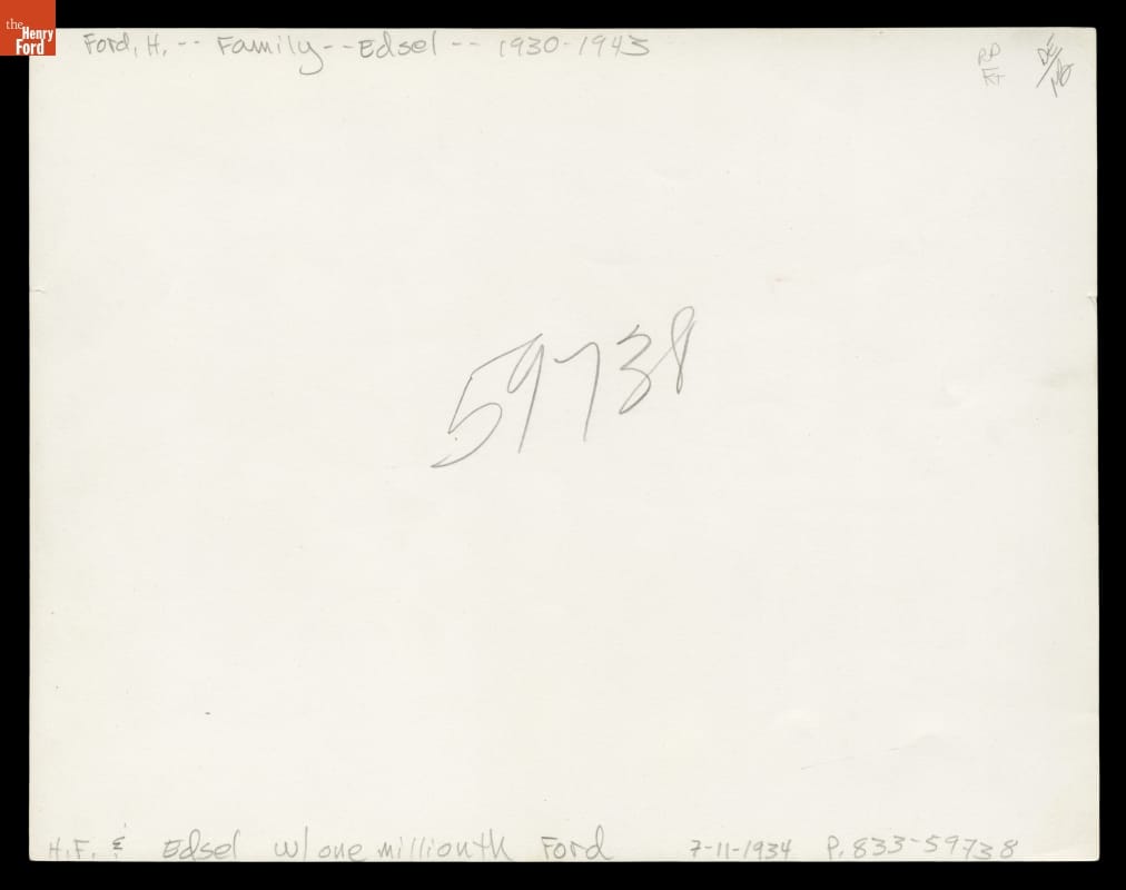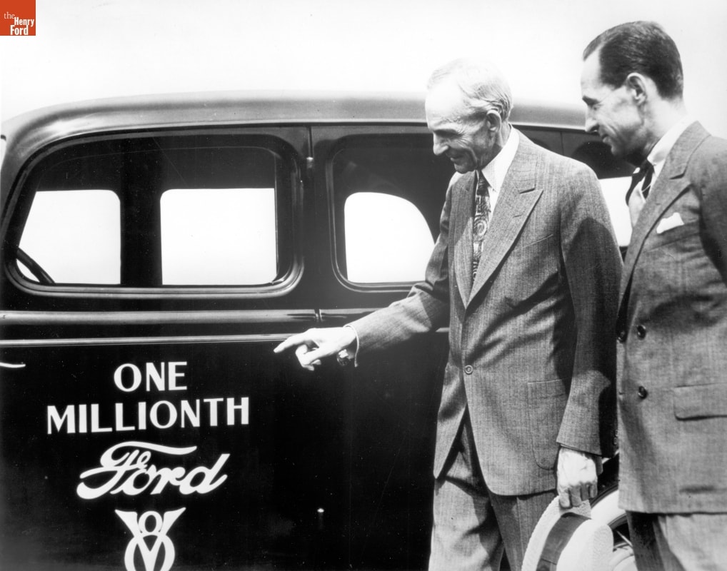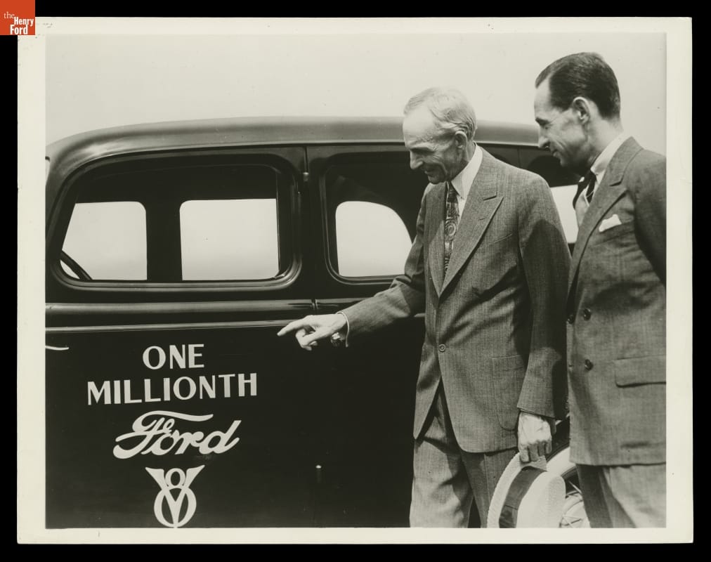 Henry Ford and Edsel Ford with One Millionth Ford V-8 Automobile, 1934