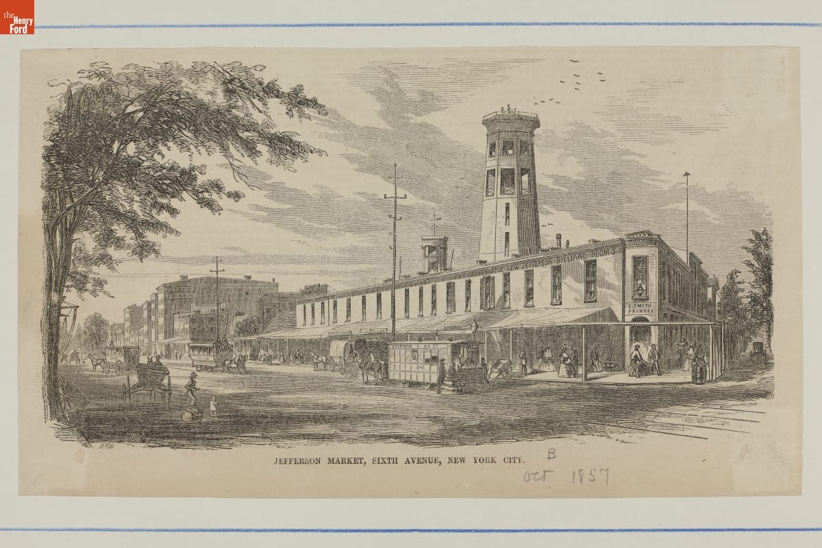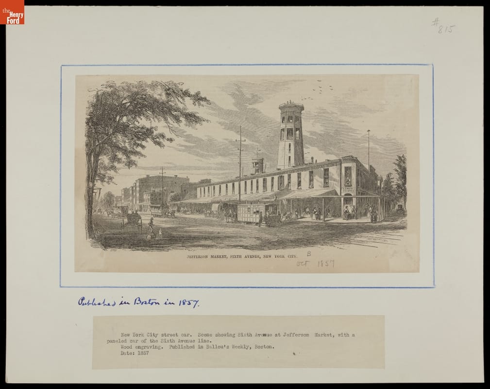 In the mid-1800s, horse-drawn streetcars provided a convenient and affordable way to get around a growing city. These streetcars traveled the main urban thoroughfares and took passengers to their workplaces, local shops and businesses, parks and other destinations. In this 1857 print, riders get on and off a streetcar at New York's Jefferson Market, while another streetcar approaches from down the street.