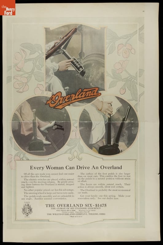 Willys-Overland made a direct appeal to women in this advertisement from the June 1915 issue of Ladies' Home Journal. The ad boasted the ease with which Overland cars could be operated by drivers of all ages. It also described driving as a tonic for wellbeing, making the extravagant claim that "driving has restored perfect health to thousands."