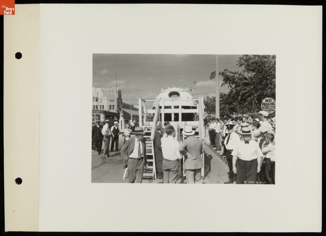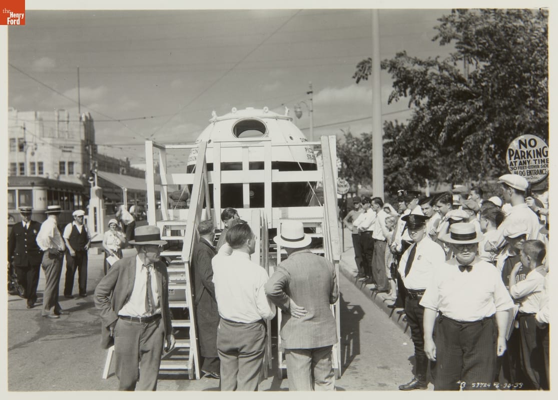 The Piccard-Compton Stratosphere Balloon launched in August 1933 at the Chicago World's Fair, piloted by Lt. Commander "Tex" Settle. The magnesium gondola and hydrogen balloon quickly crashed soon after launch due to an open valve. It is shown here in June, hauled by a Ford V-8 truck. Jean and Jeannette Piccard successfully relaunched it in October 1934 from Ford Airport.