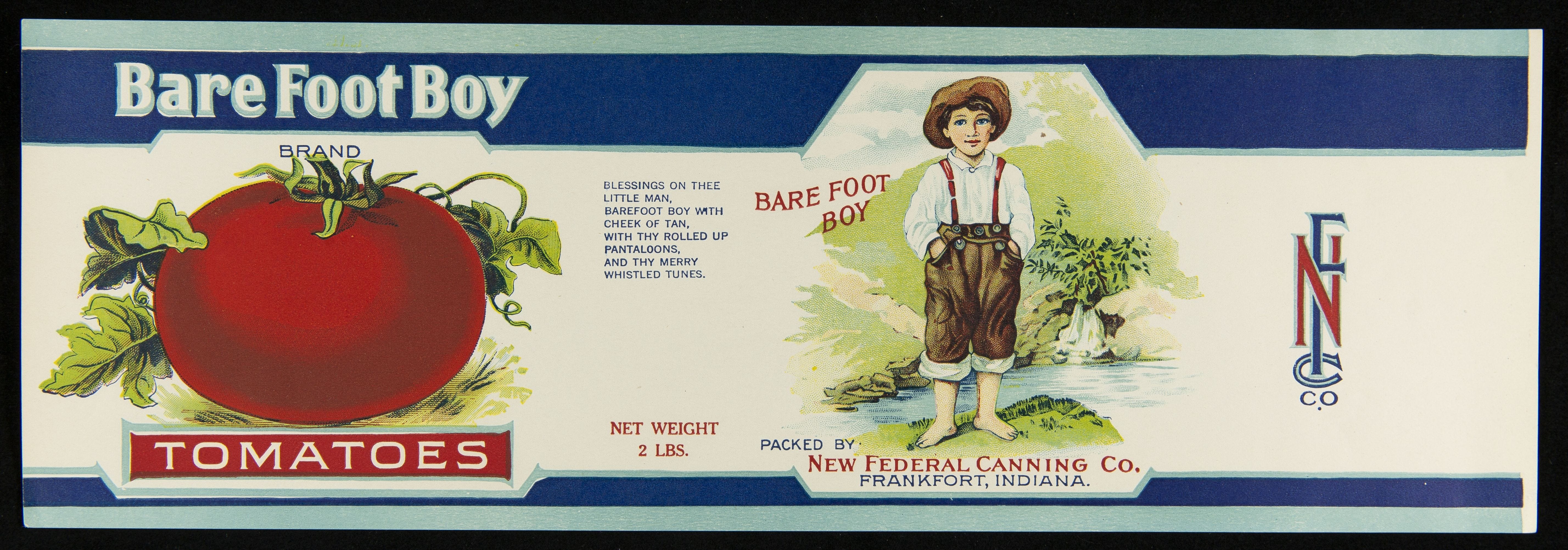 Bare foot boy / brand / Tomatoes / packed by: / New Federal Canning Co. / Frankfort, Indiana