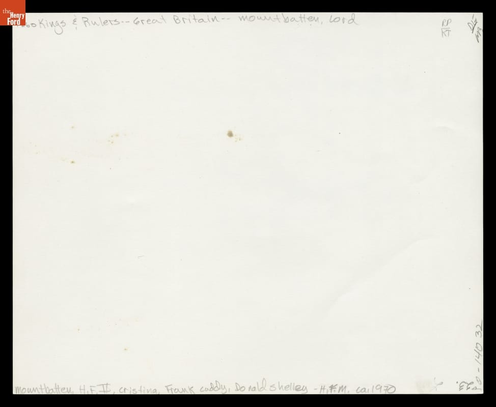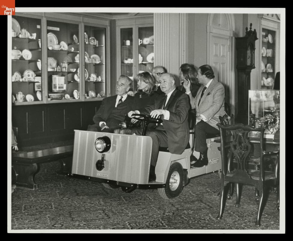 Lord Mountbatten was great-grandson of Queen Victoria, a British World War II hero and viceroy of India in 1947 during that country's partitioning and independence. In April 1972, he toured Henry Ford Museum and Greenfield Village, accompanied by Henry Ford II and Edison Institute's president, Donald Shelley. The tour included a visit through the museum's decorative arts galleries on a Cushman cart.