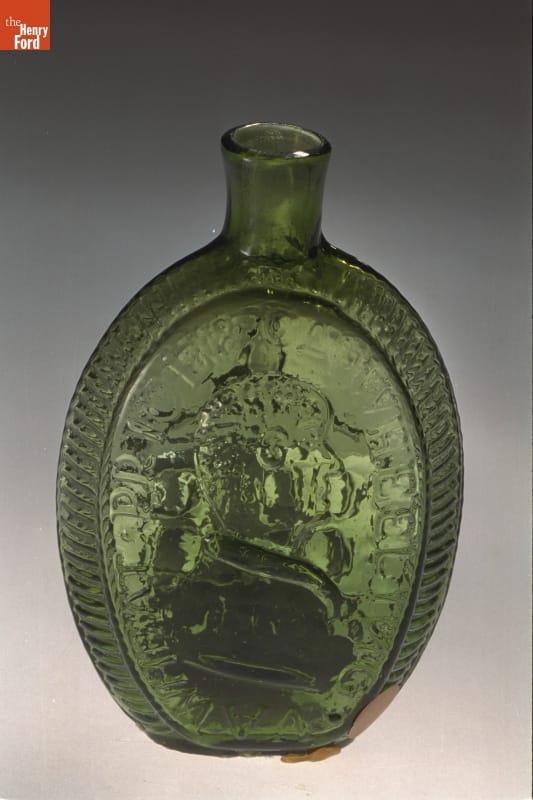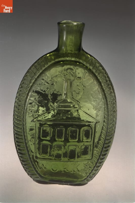 Glass factories in America began producing inexpensive, mold-formed flasks in the early 1800s. These figured flasks often were decorated with symbols of national pride or political or cultural affiliation. Other flasks provided advertisement for the glass company. Owners of Wheat, Price and Company in Wheeling, West Virginia, molded their name and an image of their factory on this flask.
