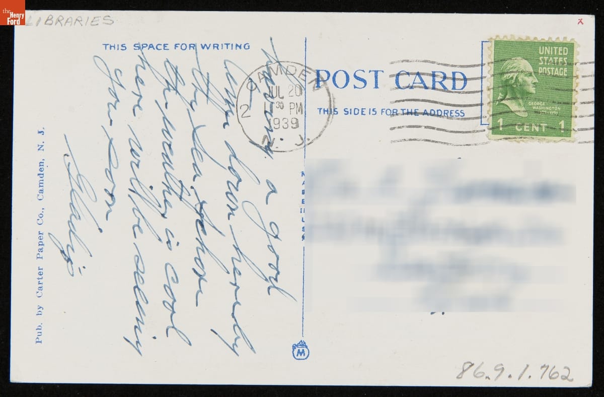 Postcard, "Public Library, Broadway and Line Streets, Camden, N.J.," circa 1939
