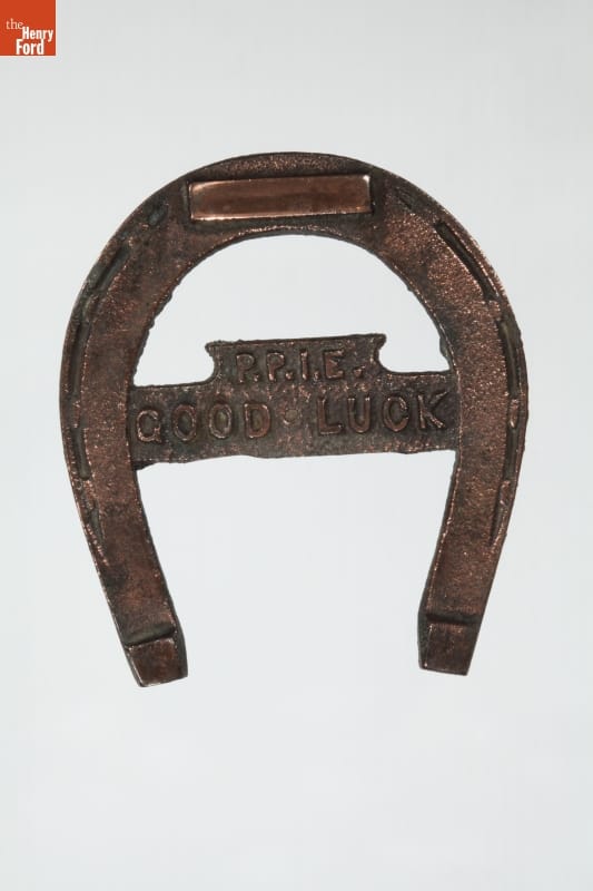 The Panama-Pacific International Exposition celebrated the 1914 completion of the Panama Canal and the 400th anniversary of the discovery of the Pacific Ocean. Nearly nineteen million people visited San Francisco, recently recovered from a devastating 1906 earthquake, during the fair in 1915. Many returned home with mementos of the exhibition, such as this souvenir "good luck" horseshoe.