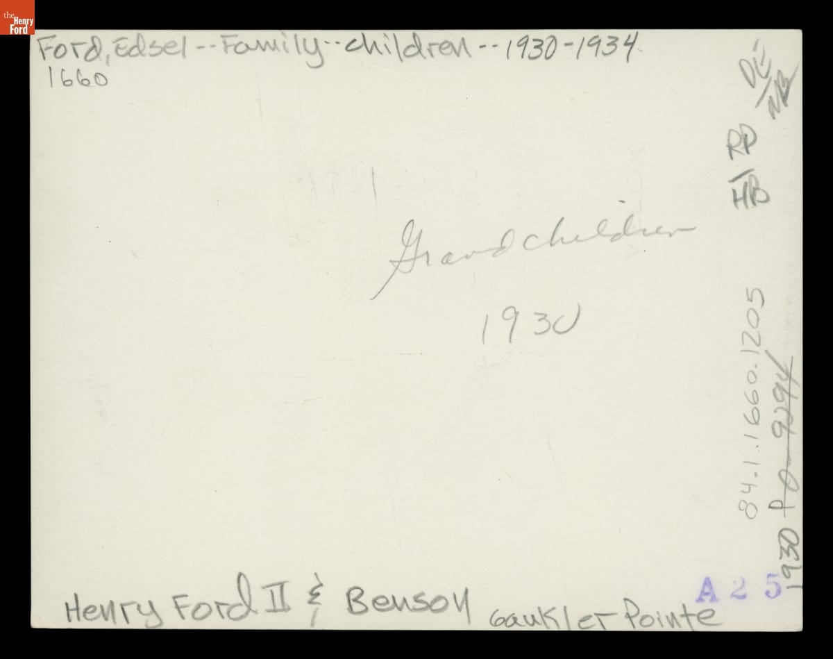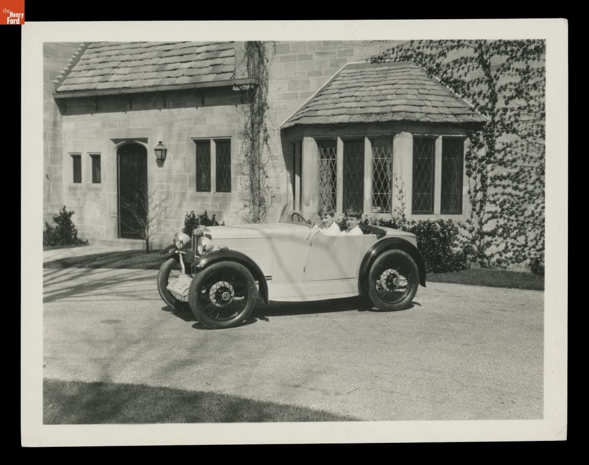 Edsel and Eleanor Ford's children drove cars around the grounds of their parents' home at Gaukler Pointe, Michigan, and around their grandparents' Fair Lane estate in Dearborn, Michigan. This photograph, taken about 1930, shows Henry Ford II and Benson Ford in a British-built MG sports car.