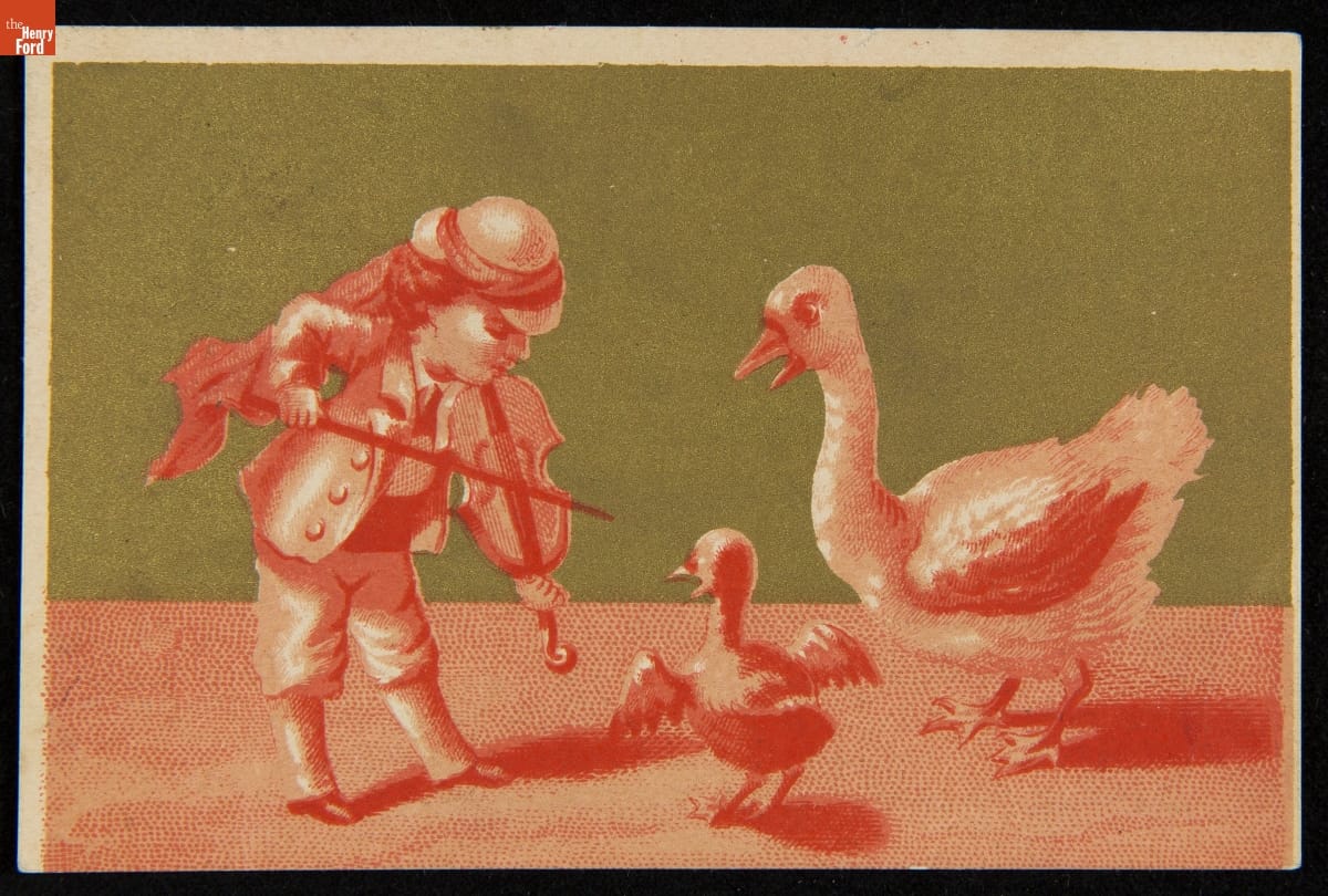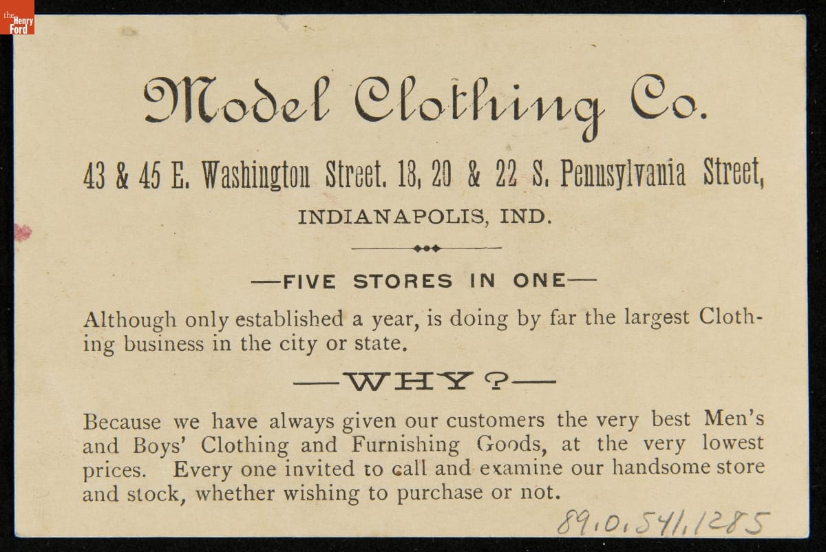 As color printing gained momentum in the late 19th century, trade cards became a major means of advertising goods and services. Americans enjoyed and often saved the little advertisements found in product packages or distributed by local merchants. This trade card advertises the Model Clothing Company.