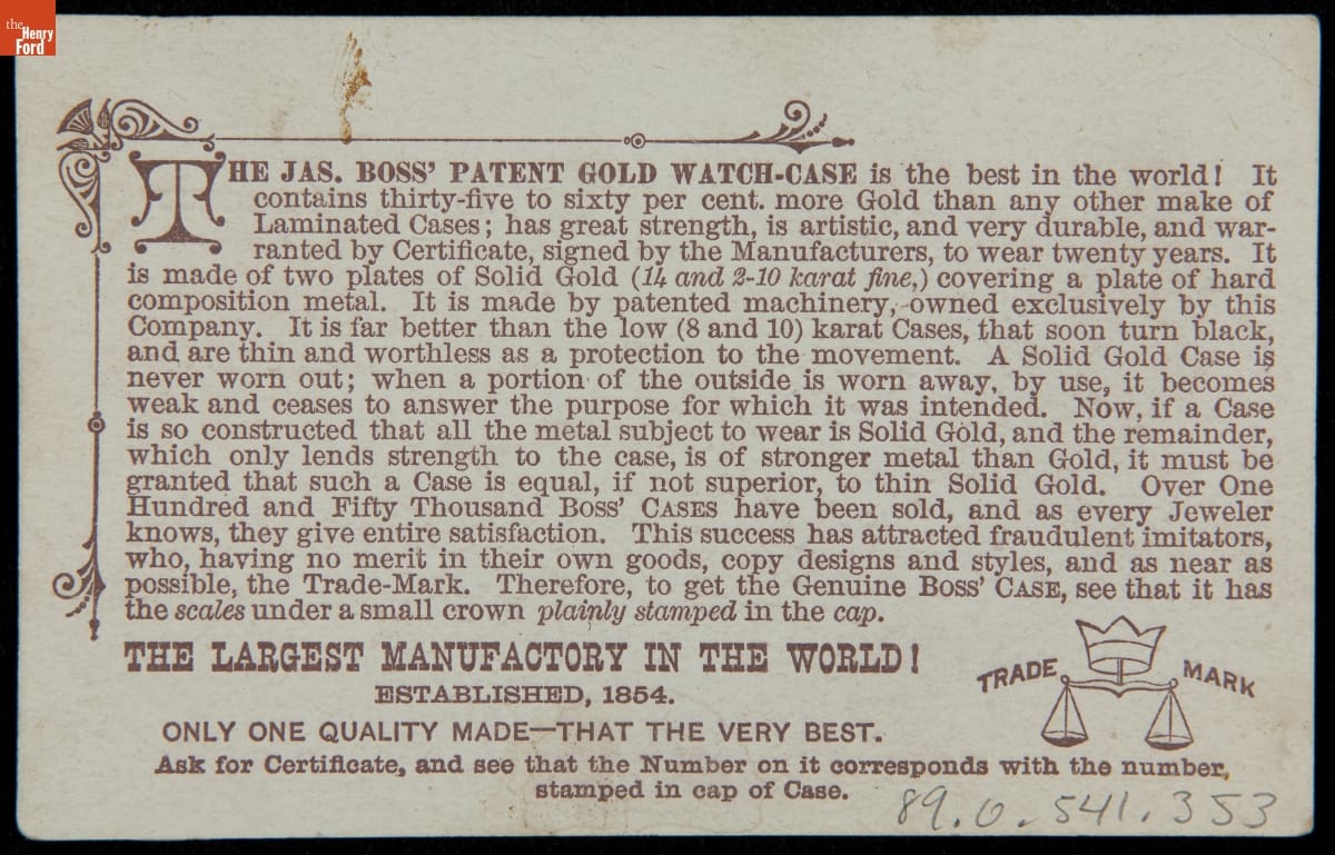 Trade Card for Boss Pat. Watch Cases by D. E. Hoxie, Northhampton, Massachusetts, 1870-1890