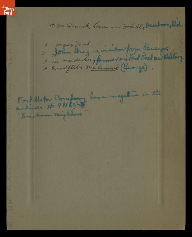 at McCormick home on Ford Rd., Dearborn, Mich. / 1 Henry Ford / 2 John Gray- a visitor from Chicago. / 3 Mr Waldecker, farmer on Ford Road neat Military / 4 Grandfather McCormick (George) / Ford Motor Company has a negative in the Archives #99165-3 / "Dearborn neighbors"