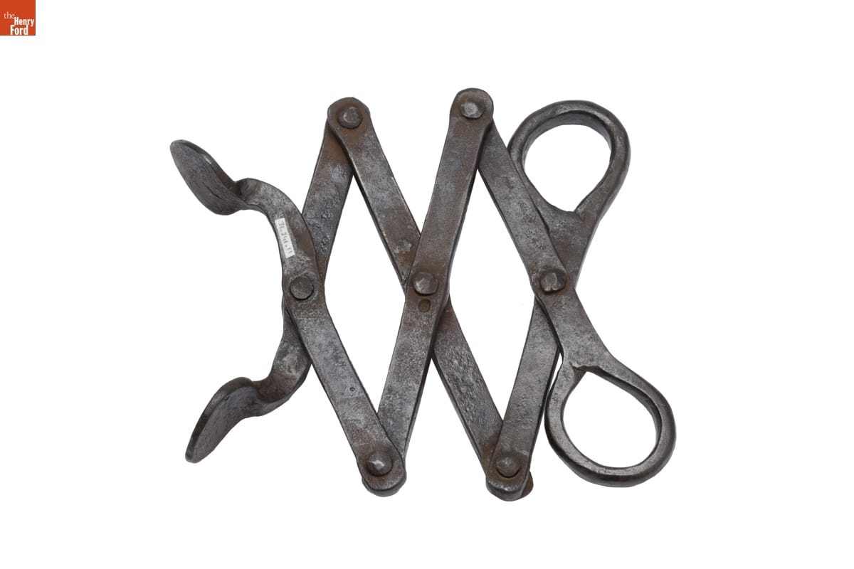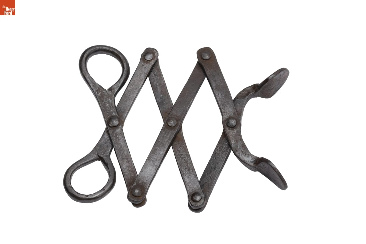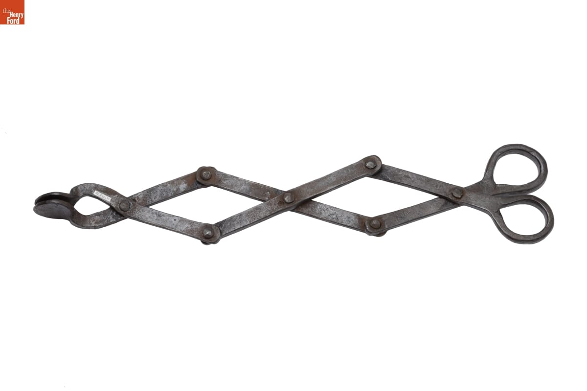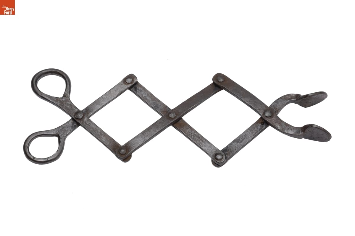 Before matches were widely available, smokers used tongs like this one to light their pipes. Closing the handles extended the flattened ends of the tongs toward the fire and helped them pick up an ember and hold it steady. Blacksmiths made the tongs from durable wrought iron that withstood the heat of the fire.