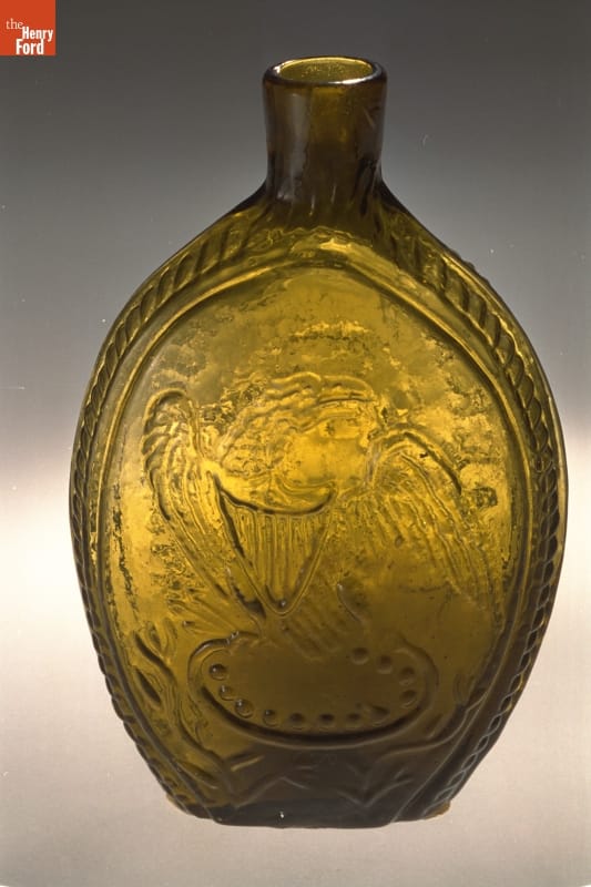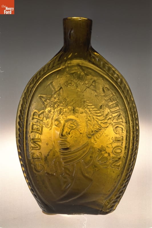 Glass factories in America began producing inexpensive, mold-formed flasks in the early 1800s. These figured flasks, often decorated with symbols of national pride or political or cultural affiliation, appealed to America's common man. Nineteenth-century Americans revered George Washington -- Revolutionary War hero, President and Father of His Country. Washington's likeness adorns at least seventy-two flask designs -- more than any other person.