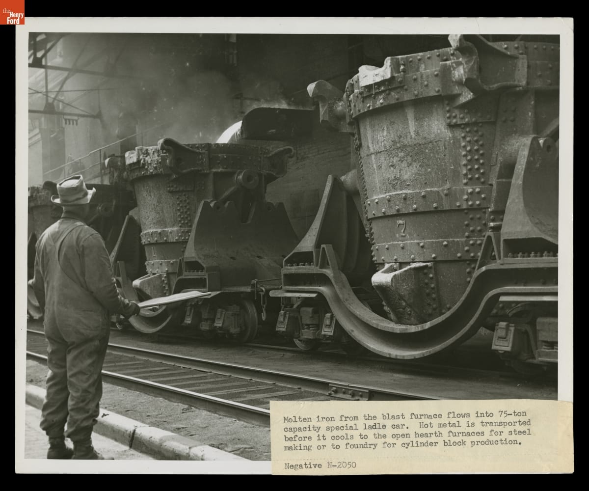 Three blast furnaces at Ford Motor Company's Rouge plant converted raw iron oxide ore into metallic iron. The molten iron was then poured into special railroad car ladles for transport to open-hearth furnaces, where the iron was further processed into steel. Together, the three blast furnaces could produce 6,700 tons of metallic iron every 24 hours.
