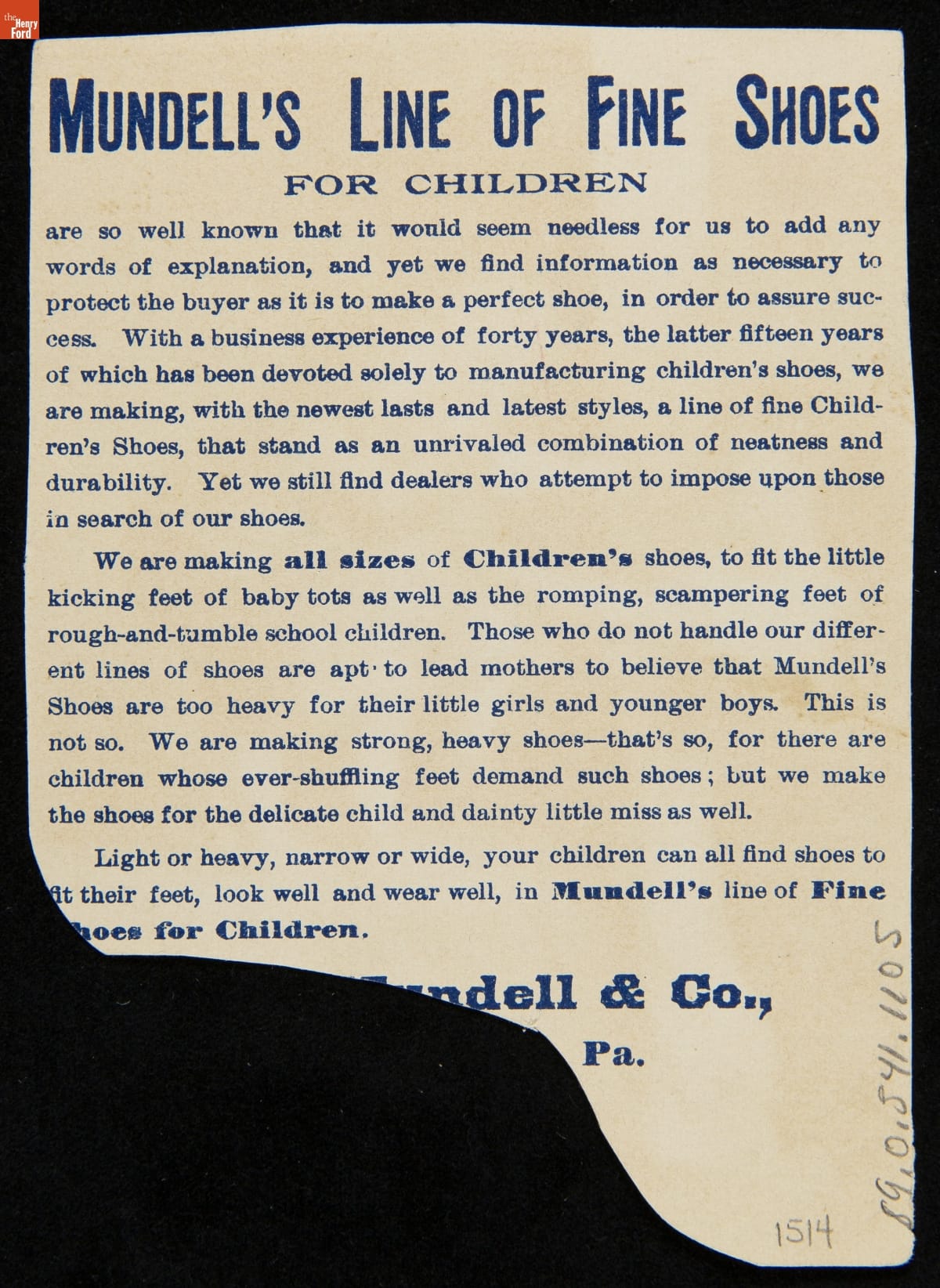 As color printing gained momentum in the late 19th century, trade cards became a major means of advertising goods and services. Americans enjoyed and often saved the little advertisements found in product packages or distributed by local merchants. This trade card advertises Solar Tip and Pansy Shoes for children, sold by John Mundell & Company.